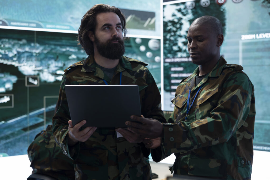 Special operations soldier allocating resources to different units based on mission needs, examines strategic data on a big screen in military control center. Marine corps troops. Camera B.
